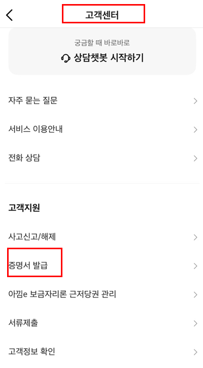 - 카카오뱅크 앱 → 고객센터 → 증명서 발급