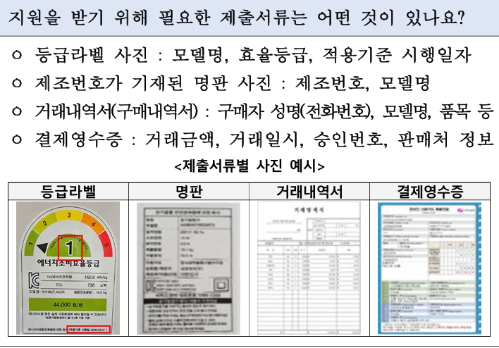 모든 제품은 에너지소비효율 1등급 라벨이 부착되어 있어야 하며, 공식 등록 제품만 환급 대상입니다.